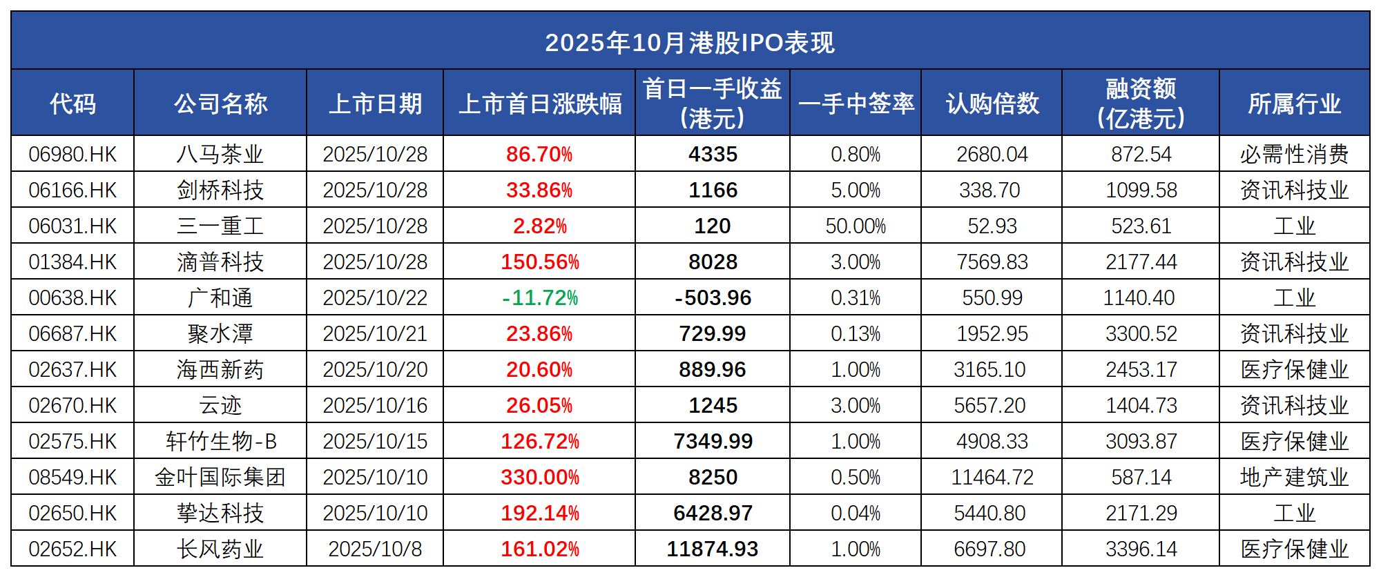 10月28日,四家企业扎堆登陆港股,IPO市场热闹开锣。截至收盘,滴普科技涨150.56%,八马茶业涨86.70%,剑桥科技涨33.86%,三一重工涨2.82%。 暗盘交易:11月5日16:15-18:30 回溯10月行情,新股市场持续保持前期的火热节奏,截至发稿,共有12只新股成功登陆港股。其中,金叶国际集团上市首日大涨330%,刷新2025年新股首 日涨幅记录。 | | | | | 2025年10月港股IF | | --- | --- | --- | --- | --- | | 代码 | 公司名称 | 上市日期 | 上市首日涨跌幅 | 首日一手收 | | | | | | (港元) | | 06980.HK | 八马茶业 | 2025/10/28 | 86.70% | 4335 | | 06166.HK | 剑桥科技 | 2025/10/28 | 33.86% | ت ت ج | | 06031.HK | 三一重工 | 2025/10/28 | 2.82% | 120 | | 01384.HK | 滴普科技 | 2025/10/28 | 150.56% | 8028 | | 00638.HK | 广和通 | ...