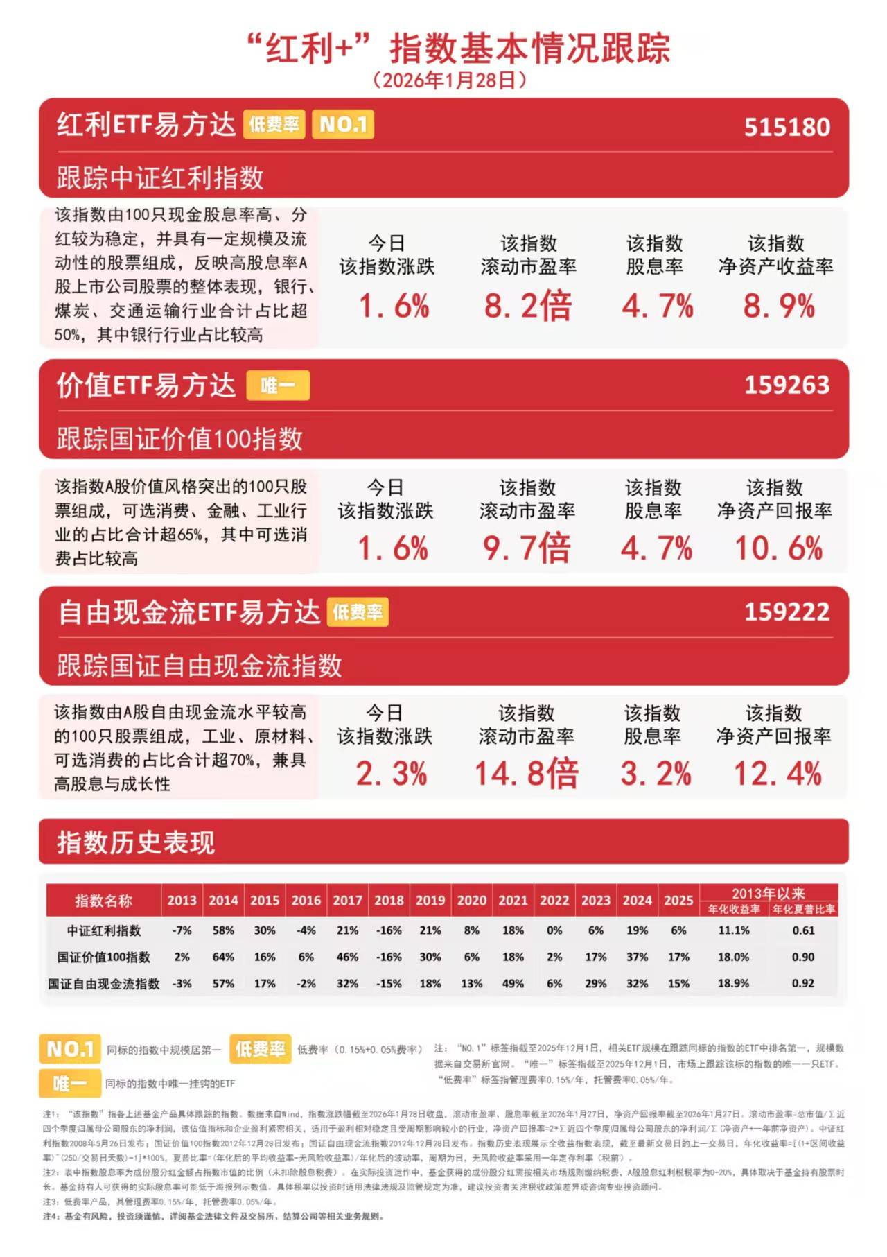 “红利+”指数集体涨超1%,关注价值ETF易方达(159263)、自由现金流ETF易方达(159222)等产品投资价值