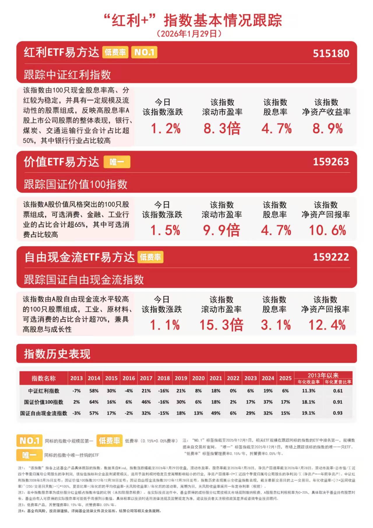 1月29日,市场震荡分化,大盘股表现占优,有色金属、能源、金融板块涨幅居前。截至收盘,国证价值100指数上涨1.5%,中证红利指数均上涨1.2%,国 证自由现金流指数上涨1.1%。相关ETF受资金关注,价值ETF易方达(159263)和自由现金流ETF易方达(159222)近10个交易日均连续获资金净流入。 国证价值100指数采用"高分红+高自由现金流+低市盈率"三维筛选体系,优选价值标的,历史表现稳健;国证自由现金流指数则采用自由现金流率进行选 样,兼具高股息与成长性。价值ETF易方达(159263)和自由现金流ETF易方达(159222)分别跟踪以上指数,可助力投资者把握相关风格投资机遇。 | 红利ETF易方达 低费率 NO.1 | | | | | | --- | --- | --- | --- | --- | | 跟踪中证红利指数 | | | | | | 该指数由100只现金股息率高、分 | | | | | | 红较为稳定,并具有一定规模及流 | ▽日 | 该指数 | 该指数 | is | | 动性的股票组成,反映高股息率A | 该指数涨跌 | 滚动市盈率 | 股息率 | 净资 | | 股上市公司股票的 ...