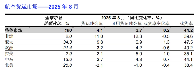 航空货运运营环境的重要指标变化 智通财经APP获悉,近日,国际航空运输协会(IATA,以下简称"国际航协")发布2025年8月全球航空货 运定期报告。全球航空货运总需求,按照货运吨公里(CTK)同比2024年8月增长4.1%(国际需求增长 5.1%)。航空货运运力(可用货运吨公里,ACTK)同比2024年8月增长3.7%(国际运力增长5.5%)。 北美航空公司8月航空货运需求同比下降2.1%,在所有地区中增长最慢。运力同比下降1.0%。 欧洲航空公司8月航空货运需求同比增长3.2%。运力同比增长4.2%。 1. 7月全球货运贸易同比增长5.4%。 2. 8月航油价格同比下降6.4%,连续14个月出现同比下降。 3. 8月全球制造业前景乐观,采购经理人指数反弹至51.75,为2024年6月以来的最高水平。然而,对新 出口订单的信心仍低于50荣枯线,为48.73,显示出在关税不确定性下持续保持谨慎。 国际航协理事长威利·沃尔什先生(WillieWalsh)表示:"8月航空货运需求增长4.1%,连续六个月实现同 比增长。即使全球贸易模式发生变化,货运量仍在继续增长。随着托运人试图将关税变化的风险降至最 低,部分高价 ...