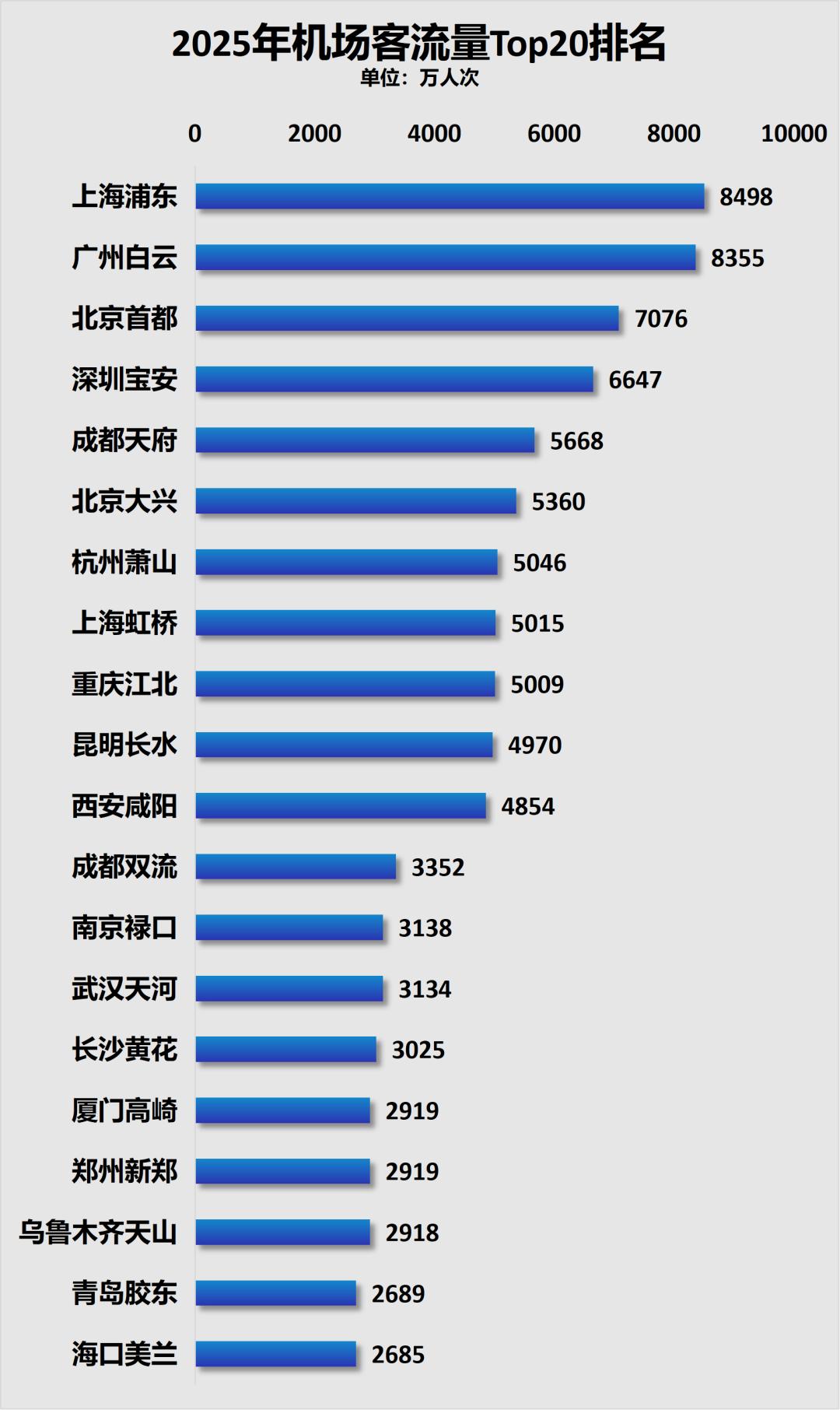 从数据可以看到: 第一,机场客流量位居前十的机场分别是上海浦东、广州白云、北京首都、深圳宝安、成都天府、北京大兴、杭州萧山、上海虹桥、重庆江北、昆明长 水。第二,从机场客流量排名,也可以看到各自的门户。 当今世界,承载流量的三大利器,一个是海港与内河港,一个是航空港,一个是陆路枢纽。 全球的人、财、物、信息、技术等,都是通过以上三大利器 实现流转。 流量的时代中,谁能成为流量引擎,谁就能赢得发展先机,或者说如虎添翼。 本篇文章要说的,就是航空流量争夺战的最新成果。 话不多说,数据先 上。 制图:城市财经;数据:民航数据分析系统 01 上海浦东、广州白云、深圳宝安、成都天府破纪录 北京是整个华北的门户,上海是华东的门户,广州是整个华南的门户,武汉是中部的门户,成都是西南门户,西安是西北门户。 以上几个城市的机场, 客流量均位居各自区域首位。 第三,2025年各大机场数据中,最大的亮点,莫过于上海浦东国际机场、广州白云国际机场双双登上8000万人次台阶。 2019年北京首都国际机场曾创下过10001万人次的历史纪录。 但当年北京大兴国际机场开通,开始分流首都国际机场,同时叠加之后的疫情影响,2020年 全国所有机 ...