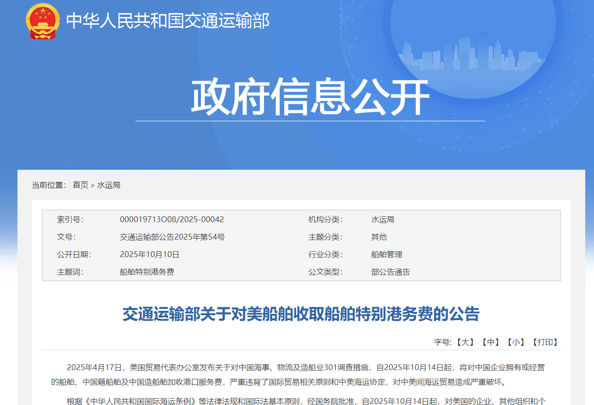 10月10日,交通运输部官网发布关于对美船舶收取船舶特别港务费的公告。 2025年4月17日,美国贸易代表办公室发布关于对中国海事、物流及造船业301调查措施,自2025年10月14 日起,将对中国企业拥有或经营的船舶、中国籍船舶及中国造船舶加收港口服务费,严重违背了国际贸易相关 原则和中美海运协定,对中美间海运贸易造成严重破坏。 根据《中华人民共和国国际海运条例》等法律法规和国际法基本原则,经国务院批准,自2025年10月14日 起,对美国的企业、其他组织和个人拥有船舶所有权的船舶;美国的企业、其他组织和个人运营的船舶;美国 的企业、其他组织和个人直接或间接持有25%及以上股权(表决权、董事会席位)的企业、其他组织拥有或运 营的船舶;悬挂美国旗的船舶;在美国建造的船舶,由船舶挂靠港口所在地海事管理机构负责收取船舶特别港 务费。有关事项公告如下: 一、对上述船舶,按航次计收船舶特别港务费,分阶段实施,具体收取标准如下(不足1净吨的按1净吨计)。 (一)自2025年10月14日起靠泊中国港口的,按每净吨400元人民币计收; 政府信息公开 当前位置:首页 > 水运局 | 露引号: | 000019713008/2 ...