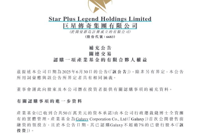 【#周杰伦概念股入股权志龙经纪公司#】港股巨星传奇午后再度走高,一度涨超12%。消息面上,公司 成为韩国知名艺人经纪公司Galaxy战略股东。该公司发布公告称,通过产业基金已认购韩国知名艺人经 纪公司Galaxy不超过7%的已发行股本。产业基金的首次交割已完成,公司出资800万美元认购产业基金 的权益,即权益的16%,余下权益由两名独立第三方持有。巨星传奇认为,成为Galaxy的战略股东预期 将为公司带来多方面的协同效益,双方正就策略性合作的细节进行深入讨论,合作范畴包括但不限于与 Galaxy艺人合作举办展览、演唱会、艺人IP及衍生品开发等。Galaxy旗下拥有权志龙、金钟国、宋康昊 等具有全球影响力的艺人资源。成为Galaxy的战略股东,被视为巨星传奇全球化IP布局的关键落子。 (一财) ...
