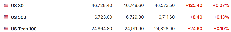 1.10月8日(周三)美股盘前,美股三大股指期货齐涨。截至发稿,道指期货涨0.27%,标普500指数期货涨0.13%,纳指期货涨0.10%。 | ■ US 30 | 46,728.40 | 46,748.60 | 46,573.50 | +125.40 | +0.27% | | --- | --- | --- | --- | --- | --- | | = US 500 | 6,723.00 | 6,729.30 | 6,711.60 | +8.40 | +0.13% | | 틀 US Tech 100 | 24,864.80 | 24,911.90 | 24,828.00 | +24.60 | +0.10% | 2. 截至发稿,德国DAX指数涨0.75%,英国富时100指数涨0.92%,法国CAC40指数涨0.90%,欧洲斯托克50指数涨0.40%。 | 3. 截至发稿,WTI原油涨1.72%,报62.79美元/桶。布伦特原油涨1.50%,报66.43美元/桶。 | | --- | | ■ WTI原油 | 2025年11月 | 62.79 | 62.81 | 62.08 | +1.06 | +1.72% | ...
