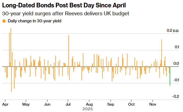 智通财经APP获悉,周三,先锋集团和皇家伦敦资产管理公司(RLAM)购入了英国国债。英国财政大臣 雷切尔·里夫斯的预算方案在很大程度上获得了市场的认可,这推动了自四月以来较长期英债的最大涨 幅。 和许多同行一样,先锋集团国际利率主管Ales Koutny在预算出台前已减少了持有的英国国债数量,因 为他预计届时市场波动会加剧。但他表示,在里夫斯发表声明提高税收并巩固英国财政状况之后,他于 周三又重新开始购买 30 年期债券。他称,鉴于当前价格过于悲观,他可能会进一步增加投资比重。 Koutny在接受采访时表示:"该预算并未对英国脆弱的财政状况产生太大影响。但市场仍为该国贴上了 过高的风险溢价标签。" 30年期英国国债因对经济前景的反应更为敏感,因此在周三引领了债券市场的上涨。其收益率下降了 12 个基点,这是自 4 月以来(也是贸易关税冲突最严重的时期)的最大单日跌幅。 但最初的市场反应却并不明确:起初,在英国财政监管机构错误发布预测之后,英国国债的价格先是上 涨随后又下跌;而在此之后,里夫斯才向议会提交了相关方案。 RLAM利率与现金业务主管Craig Inches利用了这种波动性,当债券价格上涨时他便卖出债 ...