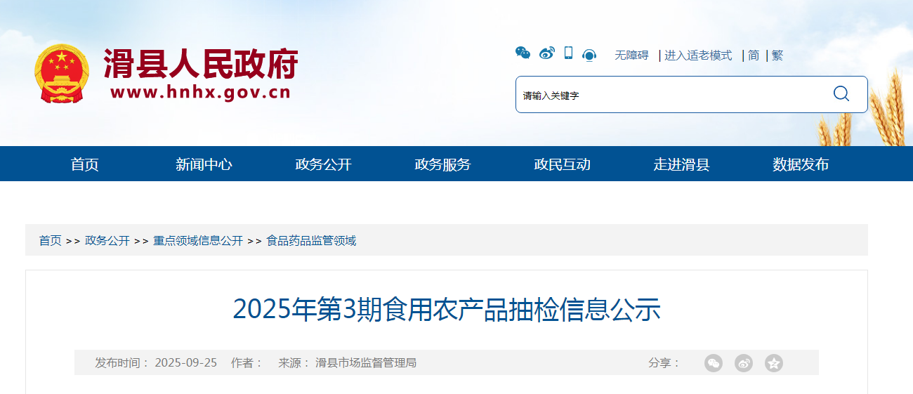 河南省滑县市场监督管理局2025年第3期食用农产品抽检信息公示