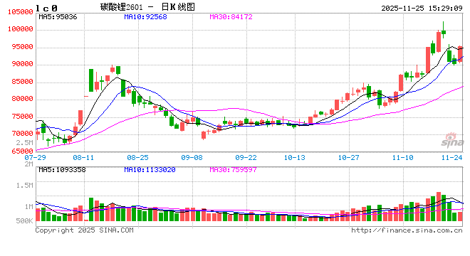 来源:新浪网 2025年11月25日,国内主力合约涨多跌少,碳酸锂涨超4%,沪银、多晶硅涨近3%,苹果、、沪金、玻 璃涨超1%。跌幅方面,集运欧线跌近8%,棕榈油、低硫(LU)、跌超1%。 富宝资讯数据显示,今日富宝电碳基差指数为-460元/吨(持平);电池级碳酸锂报90000元/吨(持 平);工业级碳酸锂(综合)报89000元/吨(持平);电池级碳酸锂长协均价83550元/吨(+400元/ 吨);氢氧化锂指数报79667元/吨(持平);金属锂指数报610000元/吨(持平);富宝卤水(硫酸 锂)折扣系数报76%(持平)。 【免责声明】本文仅代表作者本人观点,与和讯网无关。和讯网站对文中陈述、观点判断保持中立,不 对所包含内容的准确性、可靠性或完整性提供任何明示或暗示的保证。请读者仅作参考,并请自行承担 全部责任。邮箱:news_center@staff.hexun.com ...