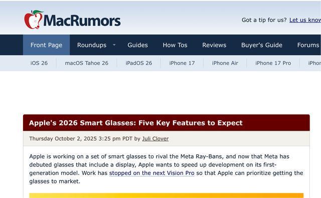 来源:环球网 【环球网科技综合报道】据海外科技媒体MacRumors透露,苹果正加速研发一款智能眼镜,旨在与Meta 的雷朋系列展开竞争。面对Meta已推出带显示屏的智能眼镜,苹果希望加快其首代产品的开发进程, 甚至已暂停下一代Vision Pro的部分工作,以优先推进眼镜产品上市。 | MacRumors | | | | | Got a tip for us? Let us knov | | | --- | --- | --- | --- | --- | --- | --- | | Front Page | Roundups | Guides | How Tos | Reviews | Buyer's Guide | Forums | | IOS 26 | macOS Tahoe 26 | iPadOS 26 | iPhone 17 | iPhone Air | iPhone 17 Pro iPhor | | 1. 时尚配饰定位 与初代Apple Watch类似,苹果眼镜将首先是一款时尚配饰,而非款式有限或造型笨重的设备。苹果计 划提供多种镜框与镜腿材质选项,以满足用户的个性化审美。尽管眼镜内部需容纳电池、 ...