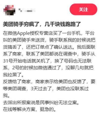 付了钱,下了单,配送环节却把货丢了。 一位来自陕西的网友在社交平台上发帖分享了自己在美团平台购买手机的遭遇,起因是网友在微信Apple授权专营店下单了一部手机,平台安排美团骑手 来送。 结果骑手联系网友说货丢了,网友联系商家却说订单完成了,而联系平台却回应在调查中。 "踢皮球"式推卸责任这让网友不得不在社交平台上征求解决方案,网友们也纷纷响应为其"出谋划策"。 10月31日,网友购买的是一台型号为薰衣草紫色256GB的苹果17,据描述,网友当日就给骑手打去电话,而骑手一直处于关机状态。过两日时,网友试图 进一步沟通时,没曾想才聊几句就被对方直接拉黑。 网友随后选择报警,警方以事件属于民事纠纷为由不予立案。网友最终将整件事的来龙去脉曝光在网上,寻求解决方案。 网友曾反馈过给商家,商家也同步反馈给了美团平台,而美团平台也回应了网友和商家,表示事件在调查中,但网友等了三天过去了都没有等来结果,直 至最后网上发酵。 最终美团平台出面将责任承担下来,并答应对商家进行赔付,商家将款项退回给网友。 不知道是因为舆论的压力而导致美团平台被迫处理,还是美团平台自身调查而产生的结果,因为平台方面并没有透露调查的过程是如何,直接给 ...