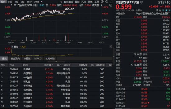 ETF盘中资讯|茅台1935京东销售狂飙840%!吃喝板块猛攻,食品饮料ETF华宝(515710)大涨超1%!