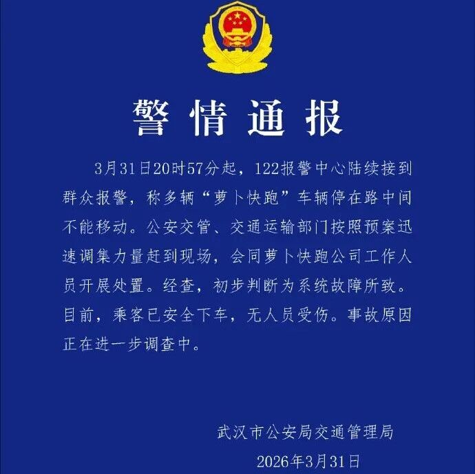 Group 1 - On March 31, 2023, multiple reports were received by the Wuhan Public Security Bureau regarding "Luobo Kuaipao" vehicles being immobilized in the middle of the road due to a system malfunction [1] - Passengers were safely evacuated from the vehicles, and there were no reported injuries [1] - Users from Hubei reported issues with the service, including being stranded on elevated roads and receiving inadequate customer support, attributing the problems to "network issues" [1]