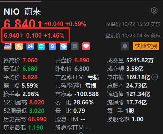 | NIO 蔚来 | | | | --- | --- | --- | | 6 840 + +0.040 +0.59% | | 收盘价 10/22 15:59 美东 | | 6.940 + 0.100 +1.46% | | 盘前价 10/23 04:36 美东 | | 三分 24 号 8 9 日 0 | | ● 快捷交易 | | 最高价 7.060 | 开盘价 6.890 | 成交量 5245.82万 | | 最低价 6.680 | 昨收价 6.800 | 成交额 3.58亿 | | 平均价 6.828 | 市盈率TM 亏损 | 总市值 169.18亿 (…) | | 振 幅 5.59% | 市盈率(静) 亏损 | 总股本 24.73亿 | | 换手率 2.96% | 市净率 -100.588 | 流通值 121.34亿 | | 52周最高 8.020 | 委 - 28.66% | 流通股 17.74亿 | | 52周最低 3.020 | 量 比 0.79 | 色 手 1股 | | 历史最高 66.990 | 股息TIM -- | 换股比率 1.00 | | 历史最低 1.190 | 股息率TTM -- | | ...
