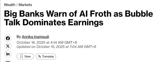 尽管AI热潮助推华尔街银行创下交易和投行业务的纪录业绩,但多位大行高管在本周财报电话会议上 对AI行业的过度狂热发出警告。 10月16日,据媒体报道,高盛首席执行官David Solomon在周二的财报电话会议上暗示当前形势与互联 网泡沫存在相似之处,称该行意识到AI基础设施的巨额投资可能会导致"一些企业蓬勃发展而另一些则 走向失败的分化局面"。花旗首席财务官Mark Mason则更为直接地指出,"很难不认为某些板块可能存 在泡沫且估值过高"。 这些表态发生在银行业公布创纪录季度业绩的背景下。本季度交易活动和交易收入均创新高,部分归功 于AI带来的市场兴奋情绪。据见闻文章写道,高盛三季度营收创下公司历史上同期最高纪录,花旗三 季度五大业务板块收入均创纪录。 不过,尽管发出警示,华尔街各大银行仍在积极部署AI技术,从美国银行的虚拟助手Erica到摩根大通 的成本削减项目。高管们普遍认为AI应用仍处于早期阶段,真正的回报需要时间兑现。 他说:"这是一个重大区别,互联网泡沫实际上涉及无数从未具备可持续性的企业。"但他也警告称,市 场不可能"无限期"持续上涨。 银行积极部署AI但强调回报需时日 华尔街高官警告"AI泡 ...