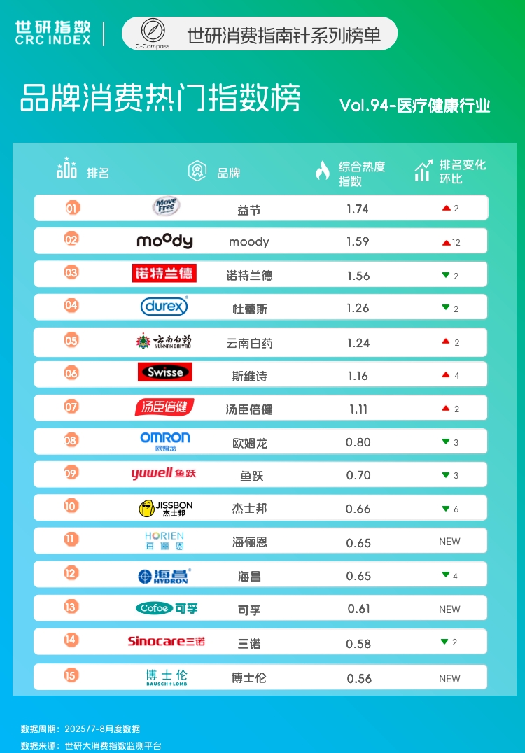医疗健康消费正经历"悦己"与"专业"的双重升级。眼部护理领域,品牌通过情感化IP与硅水凝胶科技,实现"颜值"与"健康"的平衡;健康器械赛道,则以轻 量化场景和智能闭环,推动专业监测融入日常生活。当主动健康成为主流,谁能真正实现科技温度与情感价值的深度融合?谁就将定义行业的未来形态? | ã 0 排名 | | | 综合热度 6 指数 | | | --- | --- | --- | --- | --- | | 01 | | 益节 | 1.74 | ▲ 2 | | 02 | moody | moody | 1.59 | -12 | | 03 | 诺特兰德 | 诺特兰德 | 1.56 | V 2 | | 04 | | 杜蕾斯 | 1.26 | ▼ 2 | | 05) | | 云南白药 | 1.24 | ▲ 2 | | 06 | Swisse | 斯维诗 | 1.16 | ▲ 4 | | 07 | 汤臣倍健 | 汤臣倍健 | 1.11 | ▲ 2 | | 08 | omRon 区妇龙 | 欧姆龙 | 0.80 | ▼ 3 | | 09 | yuwell 鱼跃 | 童跃 | 0.70 | ▼ 3 | | 10 | | 杰 ...