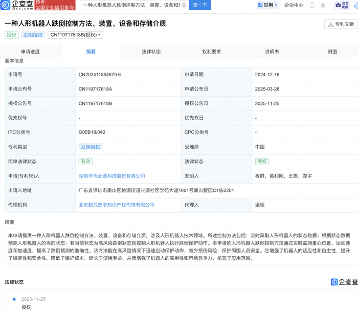企查查APP显示,近日,优必选(09880.HK)"一种人形机器人跌倒控制方法、装置、设备和存储介 质"专利获授权。企查查专利摘要显示,本申请涉及人形机器人技术领域,该申请通过实时监测重心位 置、运动速度和加速度,提高了跌倒预测的准确性。该方法能在高风险情况下迅速启动保护动作,减少 损伤风险,保护周围人员安全。它增强了机器人的适应性和自主性,提升了稳定性和安全性,降低了维 护成本,延长了使用寿命,从而增强了机器人的实用性和市场竞争力,拓宽了应用范围。 | C 1 2 2 2 2 1 2 1 | | 一种人形机器人跌倒控制方法、装置、设备和? ◎ | | 音一下 | ■应用 · | 企业中心 | 0 | 1 2 2 4 | | --- | --- | --- | --- | --- | --- | --- | --- | --- | | | 一种人形机器人跌倒控制方法、装置、设备和存储介质 | | | | | | | 业,专利文献 | | 授权 发明授权 | CN119717618B(授权) - | | | | | | | | | 申请进度 | 摘要 | 法律状态 | | 权利要求 | 说明书 | | 附图 | ...