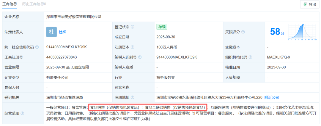 每经编辑|金冥羽 因预制菜风波被推上风口浪尖的西贝,又有新消息。 天眼查显示,深圳市玉华美好餐饮管理有限公司(下称玉华餐饮)于9月30日成立,注册资本为100万元人民币。 | | 工商信息 ● | | | | 园 数据纠错 | で天眼查 | | --- | --- | --- | --- | --- | --- | --- | | | 工商信息 历史工商信息0 | | | | | 이 음田 | | | 企业名称 | 深圳市玉华美好餐饮管理有限公司 | | | | | | 登记状态 2 | 法定代表人 | 杜 杜柳 | 存续 | 天眼评分 ② | 58 % | | | 成立日期 | | | 2025-09-30 | | | | | 注册资本 2 | 统一社会信用代码 ② | 91440300MAEXLK7Q9K | 100万人民币 | 实缴资本 | | | | 纳税人识别号 2 | 工商注册号 | 440300227070843 | 91440300MAEXLK7Q9K | 组织机构代码 2 | MAEXLK7Q-9 | | | 纳税人资质 | 营业期限 | 2025-09-30 至 无固定期限 | | 核准日 ...