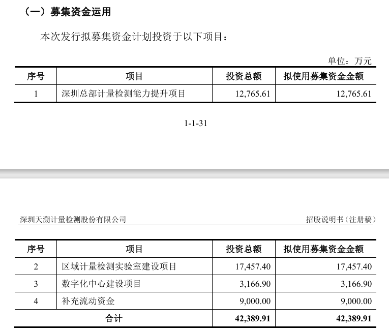 | 序号 | 项目 | 投资总额 | 拟使用募集资金金额 | | --- | --- | --- | --- | | 1 | 深圳总部计量检测能力提升项目 | 12,765.61 | 12,765.61 | | 2 | 区域计量检测实验室建设项目 | 17.457.40 | 17.457.40 | | 3 | 数字化中心建设项目 | 3.166.90 | 3,166.90 | | 4 | 补充流动资金 | 9,000.00 | 9.000.00 | | | 合计 | 42,389.91 | 42.389.91 | 招股书显示,天溯计量是一家全国性、综合型的独立第三方计量检测服务机构,主营业务为计量校准、检测、认证等专业 技术服务,客户涉及生物医药、汽车、新能源、轨道交通、能源电力、轻工日化、装备制造等国民经济多个领域。公司致 力于通过优质、高效的专业技术服务,为企业品质保驾护航,助力我国生产制造的高质量发展,落实制造强国、质量强国 战略要求。 截至2025年6月末,公司已发展完善了几何量、热学、力学、电磁学、无线电、时间和频率、声学、光学、化学、电离辐射 等十大计量校准领域及综合性专用测量仪器共计1,417项 ...