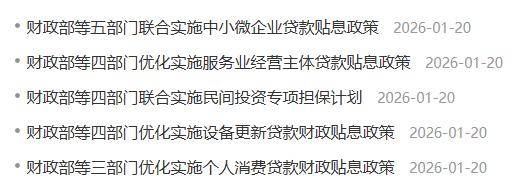 重磅利好来了! 1月20日,财政部官网发布多份政策文件,包括优化实施个人消费贷款财政贴息政策、优化实施设备更 新贷款财政贴息政策、优化实施服务业经营主体贷款贴息政策、实施民间投资专项担保计划、实施中小 微企业贷款贴息政策等。 | 。财政部等五部门联合实施中小微企业贷款贴息政策 | 01-20 | | --- | --- | | 。财政部等五部门优化实施服务业经营主体贷款贴息政策 | 01-20 | | 。财政部等五部门联合实施民间投资专项担保计划 | 01-20 | | 。财政部等五部门优化实施设备更新贷款财政贴息政策 | 01-20 | | 。财政部等三部门优化实施个人消费贷款财政贴息政策 | 01-20 | | 。财政部发行2026年记账式附息(三期)国债 | 01-19 | 来看详情—— 个人消费贷款财政贴息政策实施期限延长至2026年底 1月20日,财政部、中国人民银行、金融监管总局发布《关于优化实施个人消费贷款财政贴息政策有关 事项的通知》。 中国基金报记者 晨曦 【导读】财政部发布多项重磅政策,个人消费贷财政贴息政策实施期限延长至2026年底 《通知》称,将个人消费贷款财政贴息政策实施期限延长至2 ...