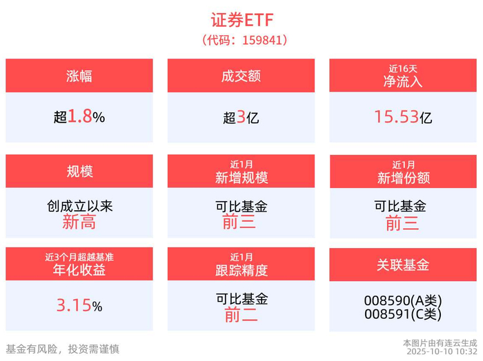 首次突破90亿元!连续19日“吸金”的证券ETF(159841)规模创新高,昨日净流入超5亿元,最新单日成交巨幅放量超10亿元!