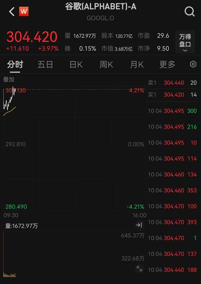 Group 1 - Google's stock rose over 3.9% after the market opened on November 20, reaching a total market capitalization of $3.68 trillion, slightly surpassing Microsoft and entering the top three in U.S. stock market capitalization [1] - The stock price of Alphabet Inc. (GOOGL) was reported at $304.42 with a market cap of $3.68 trillion and a price-to-earnings ratio of 9.50 [2]
