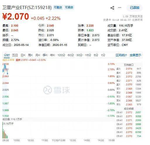1月16日,卫星产业再度活跃。数据显示,截至9时36分,两融标的卫星产业ETF(159218)放量涨 3.01%,成分股中科星图、臻镭科技、信科移动-U、电科芯片、信维通信涨幅居前。 | 卫星产业ETF(SZ:159218) 可融资 可英空 | | | | | | | | | --- | --- | --- | --- | --- | --- | --- | --- | | ¥2.070 +0.045 +2.22% | | | | | 1.59 万球友失注 | | | | 景高:2.100 今年:2.045 | | 张德:2.228 | | 成交量:116.10万手 | | | | | 最低:2.045 昨夜:2.025 | | 跌停:1.823 | | Fran: 2.41 Z | | | | | 损手:一 市价:2.071 | | 单位净值: 2.073 | | 草全份额:17.91亿 | | | | | 振幅: 2.72% 溢价率:0.58% | | 景计净值:2.073 | | 78072 :图母出版 | | | | | 成立日:2025-05-14 | 净值日期:2026-01-15 | 到期日:一 ...