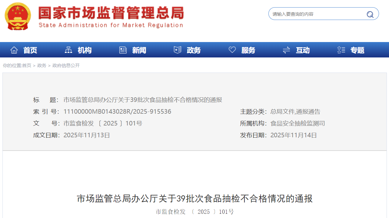 转自:市场监管总局网站 | 命 首页 品 机构 | | 割 新闻 | 尾 政务 | ♡ 服务 ⇌ 互动 | | --- | --- | --- | --- | --- | | 你的位置:首页 > 政务 > 政府信息公开 | | | | | | 标 | 题: 市场监管总局办公厅关于39批次食品抽检不合格情况的通报 | | | | | 索 引 号: 11100000MB0143028R/2025-915536 | | | | 主题分类:总局文件,通报通告 | | 文 | 号: 市监食检发 〔 2025 〕101号 | | | 所属机构:食品安全抽检监测司 | | 成文日期:2025年11月13日 | | | | 发布日期: 2025年11月14日 | 近期,市场监管总局组织食品安全监督抽检2127批次样品,检出39批次样品不合格。产品抽检结果可查询https://spcjsac.gsxt.gov.cn/。 对抽检发现的不合格食品,有关省级市场监管部门已组织开展核查处置。 现将监督抽检不合格食品具体情况通报如下: (一)寻味老店(经营者为江西省赣州市寻乌县长顺副食商行)在抖音(手机APP)销售的、标称江西省赣州市会 ...