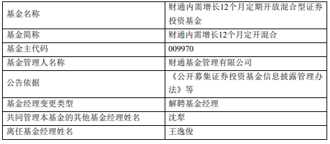 中国经济网北京11月17日讯 近日,财通基金公告,王逸俊离任财通内需增长12个月定开混合。 | 基金名称 | 财通内需增长12个月定期开放混合型证券 | | --- | --- | | | 投资基金 | | 基金简称 | 财通内需增长12个月定开混合 | | 基金主代码 | 009970 | | 基金管理人名称 | 财通基金管理有限公司 | | 公告依据 | 《公开募集证券投资基金信息披露管理办 | | | 法》等 | | 基金经理变更类型 | 解聘基金经理 | | 共同管理本基金的其他基金经理姓名 | 沈犁 | | 离任基金经理姓名 | 王逸俊 | (责任编辑:康博) 王逸俊历任上海同安投资管理有限公司定增与衍生品研究员、研究负责人,浙江赛智科创资本管理 有限公司投资总监、副总经理。2023年2月加入财通基金管理有限公司,曾任专户投资部投资经理,现 任基金投资部基金经理。 财通内需增长12个月定开混合成立于2020年8月7日,截至2025年11月14日,其今年来收益率为 59.10%,成立来收益率为-5.94%,累计净值为0.9406元。 ...