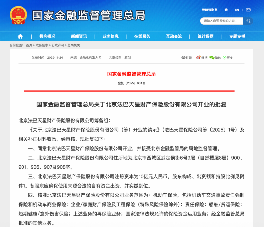 备受关注的一家新财险公司获批开业。 近日,金融监管总局官网公布的批文显示,北京法巴天星财产保险股份有限公司(以下简称"法巴天星财险") 已于10月17日获批开业,并接受北京金融监管局的属地监督管理。 另据此前消息,法巴天星财险于10月24日获得保险许可证。获得保险许可证是设立保险公司的重要一步,在程 序上处于新公司获批筹建和获批开业之后,在工商注册之前。 资料显示,法巴天星财险住所地为北京市西城区武定侯街6号9层,公司业务范围为:机动车保险,包括机动车 交通事故责任强制保险和机动车商业保险;企业/家庭财产保险及工程保险(特殊风险保险除外);责任保 险;船舶/货运保险;短期健康/意外伤害保险;上述业务的再保险业务;国家法律法规允许的保险资金运用业 务;经金融监管总局批准的其他业务。 开业批文还首次公布了法巴天星财险的股东结构。法巴天星财险注册资本10亿元人民币,法国巴黎保险集团、 四川银米科技有限责任公司、大众汽车金融服务海外股份公司等三大股东分别持股49%、33%、18%。 上述三大股东中,法国巴黎保险集团是全球著名的法国巴黎银行集团成员之一,在中国市场深耕已久。2014年 9月,法国巴黎保险集团受让中荷人寿 ...