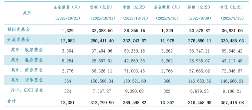| 类别 | 基金数量(只) | 份额(亿份) | 净值(亿元) | 基金数量(只) | 份额(亿份) | 净值(亿元) | | --- | --- | --- | --- | --- | --- | --- | | | (2025/10/31) | (2025/10/31) | (2025/10/31) | (2025/9/30) | (2025/9/30) | (2025/9/30) | | 封闭式基金 | 1,329 | 33,388.50 | 36.855.15 | 1,329 | 33,578.87 | 36.931.06 | | 开放式基金 | 12,052 | 280,411. 40 | 332,743.67 | 11,978 | 276,880.11 | 330,485.03 | | 其中:股票基金 | 3.304 | 37.404.06 | 59.259.18 | 3.262 | 36.747.21 | 59,548.42 | | 其中:混合基金 | 5.284 | 28.807.61 | 42.569.36 | 5.262 | 28.935.07 | 43.117.48 | | 其中:债券 ...