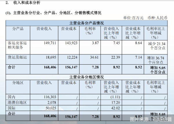 南航减亏六成靠货运,2025年将扩线降本 3月26日晚间,南方航空(以下简称"南航")发布2024年业绩报告,净亏损16.96亿元,同比减亏 59.71%。事实上,南航2024年的客运收益同比下降,能够收获大幅减亏的成绩,更多依靠上升的货运 收益。面对国内客运票价下滑等挑战,南航2025年将向边际贡献总量最大化看齐,通过加开更多航班和 航线实现薄利多销。同时,在成本进一步提升的情况下,南航也采取了一系列降本增效举措,全力应对 扭亏决战。 | | | | | | == W. = 1 | HIT. ANIE | | --- | --- | --- | --- | --- | --- | --- | | | | | 主营业务分产品情况 | | | | | 分产品 | 营业收入 | 营业成本 | 毛利率 | 营业收入 | 营业成本 | 毛利率比上 | | | | | (%) | 比上年增 | 比上年增 | 年增减 | | | | | | 或(%) | 或(%) | (%) | | 各运及各运 | 149.711 | 143.923 | 3.87 | 7.45 | 8.64 | 减少 21.34 | | 相关服务 | ...