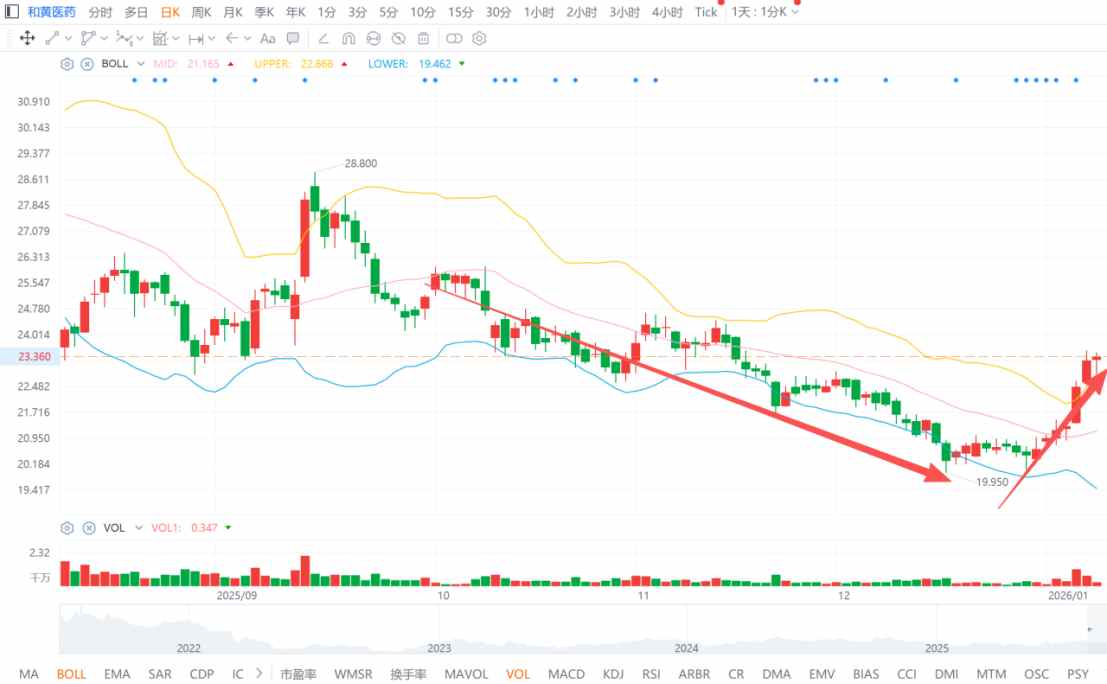 2025年,恒生医疗保健指数在经历下半年大回撤后依旧保住了50%以上的年度涨幅。相较之下,作为一家手握3款商业化创新药并拥有首创抗体靶向偶联药 物的创新药企,和黄医药(00013)却最终以8.56%的年度跌幅收场,显著跑输指数。 该公司股价在2025年最高涨幅仅36.36%,并且"跟跌不跟涨"。2025年下半年,其股价从30.75港元年内高点,一路跌至19.95港元区间低点,4个半月内最大跌 幅达到35.12%。 不过就在市场以为和黄医药股价会一路低迷下去时,其在2026年开年却走出了一波量价齐升的行情。 智通财经APP观察到,和黄医药在2026年前5个交易日持续发力,走出一段"五连阳",区间内单日成交量最大达到1545.16万股,刷新自去年10月以来的单日 成交量记录。 港股通更趋向"右侧交易" 据智通财经APP观察,和黄医药股价自去年4月初因外部环境震荡影响跌破BOLL线下轨后,其后续股价大部分时间都在BOLL线的中轨至上轨之间浮动,这 一股价表现也契合了2025年港股创新药拉升行情。但25中报的披露成为了其二级市场反转的一个转折点。 去年8月7日美股盘前,和黄医药公布了其2025年中报业绩。财报显示,公 ...