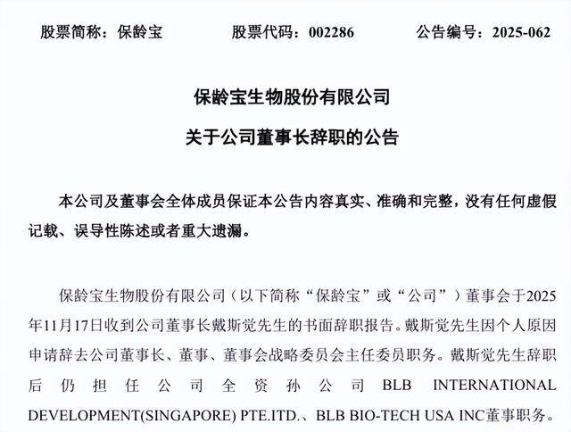 每经记者|彭斐 每经编辑|张益铭 "三十而立"的戴斯觉,选择在公司业绩强势反弹之际辞职。 辞职背后,保龄宝实控人层面的资金压力隐现。就在2024年,保龄宝变更为由戴斯觉、戴斯聪兄弟共同 控制,而由戴斯聪控制的企业所承诺的增持计划,因"资金安排"原因一再拖延。与此同时,戴斯觉本人 控制的控股股东北京永裕投资管理有限公司(以下简称"永裕投资"),年内已多次被列为被执行人,涉 及金额超2.8亿元。 曾经的A股"最年轻董事长"谢幕 根据保龄宝11月17日晚间的公告,戴斯觉因个人原因申请辞去公司董事长、董事、董事会战略委员会主 任委员职务。 公告称,戴斯觉的辞职不会导致公司董事会成员低于法定最低人数,辞职报告自送达董事会时生效。辞 职后,他仍将担任公司全资孙公司BLB INTERNATIONAL DEVELOPMENT(SINGAPORE)PTE.ITD.、 BLB BIO-TECH USA INC董事职务。 戴斯觉的"A股最年轻董事长"身份始于2021年。资料显示,戴斯觉出生于1995年1月,为中国香港居 民,拥有英国曼彻斯特大学金融经济学理学硕士学历。2021年3月25日,保龄宝召开第五届董事会第一 次会议,会议以 ...