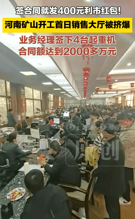 100万现金就这么堆在桌上,不是摆着看的,是真给出去的,开门红才两个小时,订单总额就已经过亿了, 可还不是当天最让人惊到的那一幕。 春节刚过,河南长垣矿山集团的销售大厅,被客户挤满整个大厅,有人早上七点就守在门口等开门。 签一份合同,老板当场发400元红包,说是"图个四季发财"。 很多人第一次听说河南矿山,会以为是个挖矿的,其实不是,一点矿都没有,卖的是起重机。 记者采访到海外部的员工张军霞,整个采访过程,她一直在笑,不是客套那种,是真的藏都藏不住的笑。 原因很简单,她刚签下了今年第一笔海外大单,800万美金,折合人民币5000多万。 开工第一天,来签这单的,是海外客户。专程过来的,不是路过,不是顺道,是冲着河南矿山的起重机来 的,一开口就是这个量级。 此前有报道提到,公司销售最高拿到过500万奖金,还有一位女销售去年全年签约4个亿。 他们的桥式起重机产销量连续19年全国第一,产品进了全球130个国家。连卡塔尔世界杯体育场建设工地 上,都有他们的设备在转。 外国客户为什么要大老远专门来交钱,他们给出的评价很朴实:产品性价比好,空间还很大。 这话听起来平平淡淡,但搁制造业里,能让人千里迢迢跑来排队,已经是最高规 ...