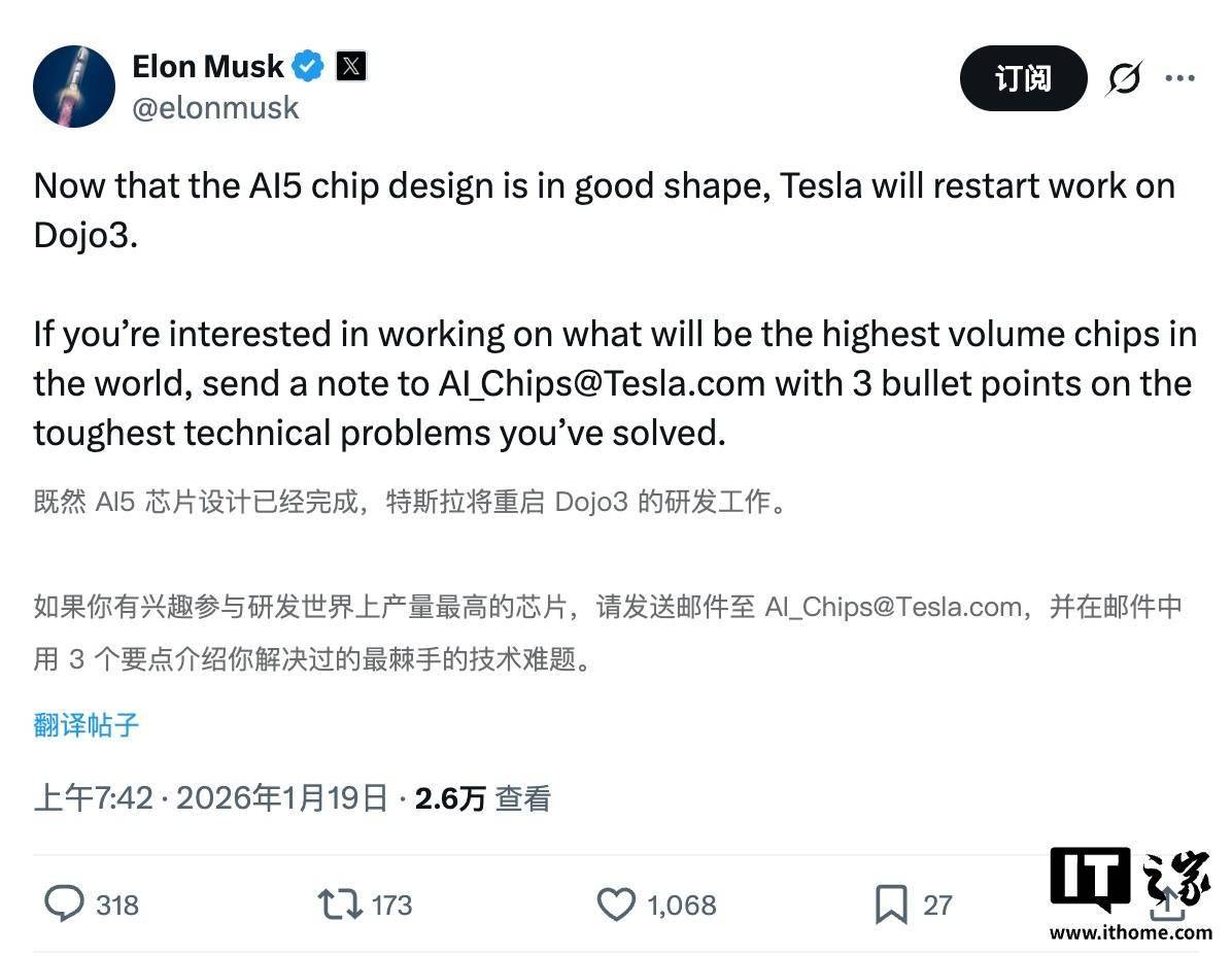 IT之家 1 月 19 日消息,今天早间,马斯克在 X 平台发文宣布,随着 AI5 芯片设计完成,特斯拉将重启超级计算机项目 Dojo 3 的开发工作。 同时,马斯克在这则帖子中发出了"招聘启事",要求"有兴趣参与研发世界上产量最高芯片"的应征者在邮件中用 3 个要点介绍自己解决过的最棘手的技术难 题。 2025 年 8 月曾有消息称,特斯拉已全面叫停 Dojo 超级计算机项目,其负责人也将离职。这一决定意味着特斯拉正式放弃开发自动驾驶所需自研芯片的计 划。知情人士透露,马斯克亲自下令关闭该项目。 当时,马斯克回复网友评论称,特斯拉分散资源并同时开发两种截然不同的 AI 芯片设计是没有意义的。特斯拉的 AI5、AI6 及后续芯片在推理方面将表现 出色,至少在训练方面相当不错,所有努力都将集中在这些芯片上面。 | | IIII i si " R ARMANNER MERIC ELLERS FRENCE the first is 14 7 un ...