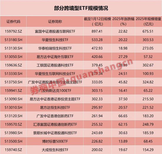 随着全球资本市场共振上涨,资金对海外市场的热情也助推跨境型ETF规模持续攀高。据统计,截至1月13日,跨境型ETF规模总量达到1.0008万亿元人民 币,这也是历史上首次突破万亿规模大关。 拉长时间来看,截至2025年初,跨境型ETF规模"仅"有4242亿元,这意味着一年多的时间里,这类产品的总体规模增幅高达136%。在席卷全球的人工智能和 创新药投资热潮下,多个主要市场在去年创下历史新高,因额度限制,资金的涌入也使得多只跨境型ETF二级市场面临溢价,限购亦成为QDII基金的共 有"标签"。 跨境ETF规模破万亿 具体来看,富国基金旗下港股通互联网ETF规模领跑,截至1月12日该基金规模高达897.41亿元,其次是华夏恒生科技ETF,约为533.28亿元,此外,华泰柏 瑞基金和易方达基金旗下两只产品规模超过400亿元,共有25只跨境ETF规模超百亿元。 | 证券代码 | 证券简称 | 截至1月12日规模 2025年涨跌幅 | | 2025年规模增量 | | --- | --- | --- | --- | --- | | | | (亿元) | (%) | (亿元) | | 159792.SZ | 富国中证港股通 ...
