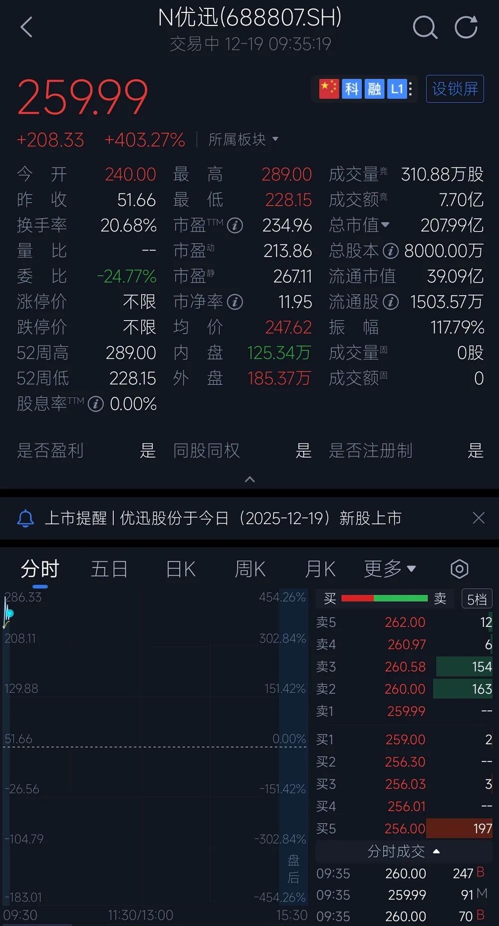 芯东西12月19日报道,今天,厦门光通信芯片龙头企业优迅股份在上交所科创版上市。 其发行价为51.66元/股,开盘价为240元/股,较发行价上涨364.6%。截至今天9点35分,优迅股份股价较发行价上涨403.25%至259.99元/股,最新总市值约 为208.0亿元。 | N优迅(688807.SH) Q G | | | | | | | --- | --- | --- | --- | --- | --- | | 交易中 12-19 09:35:19 | | | | | | | ** 科 融 L1: 设锁屏 259.99 | | | | | | | +208.33 +403.27% 所属板块 ▼ | | | | | | | 289.00 成交量* 310.88万股 240.00 最 高 | 今 开 | | | | | | 51.66 最 低 228.15 成交额声 | 昨 收 | | | 7.70 Z | | | 20.68% 市盈™✆ | 换手率 | 234.96 总市值▼ 207.99亿 | | | | | 市图型 | 量 比 | 213.86 总股本 2 8000.00万 | | | | | -24.7 ...