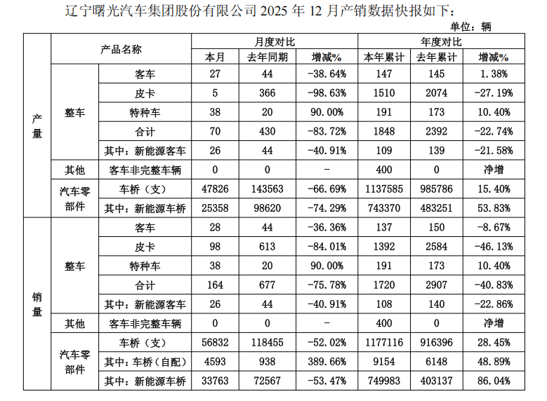 细分车型,特种车12月单月产销量和全年产销量同比去年都有显著增长,月度销量同比增长90%,年度同比增 长10.4%;皮卡产销量下降显著,成为了整体下滑的主要原因。 数据显示,汽车零部件板块表现突出。12月车桥产量达56832支,新能源车桥产量占比显著提升,全年新能源 车桥产量同比增长86.04%。自配车桥产量同步增长,进一步完善了公司产业链协同布局。 1月10日,曙光股份发布2025年12月产销数据快报,公告显示,整车业务方面,2025年全年累计产量1848辆、 销量1720辆,同比分别下降22.74%和40.83%;其中12月单月产量70辆、销量164辆,同比降幅分别为83.72%和 75.78%。 | | | | | 产品名称 | | | 月度对比 | | | 年度对比 | STATE STATE PRODUCT PRODUCTION CONSULTION CONSULTION OF | | --- | --- | --- | --- | --- | --- | --- | --- | --- | | | | | 本月 | 去年同期 | 增减% | 本年累计 | 去年累计 | 增减% | | | | 客车 ...