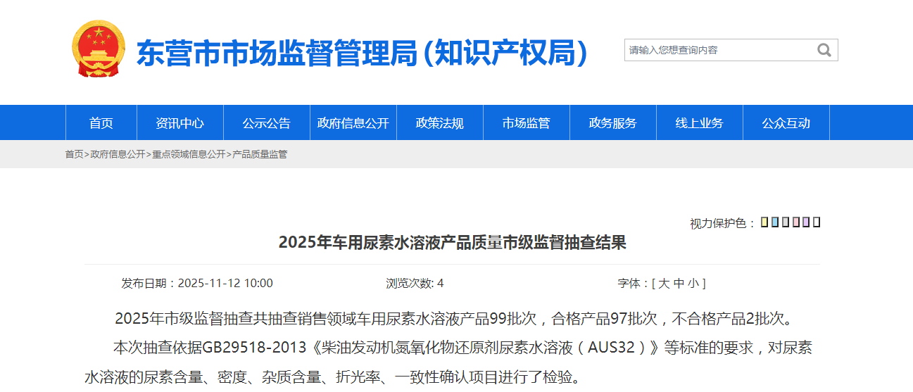 山东省东营市市场监管局发布2025年车用尿素水溶液产品质量市级监督抽查结果