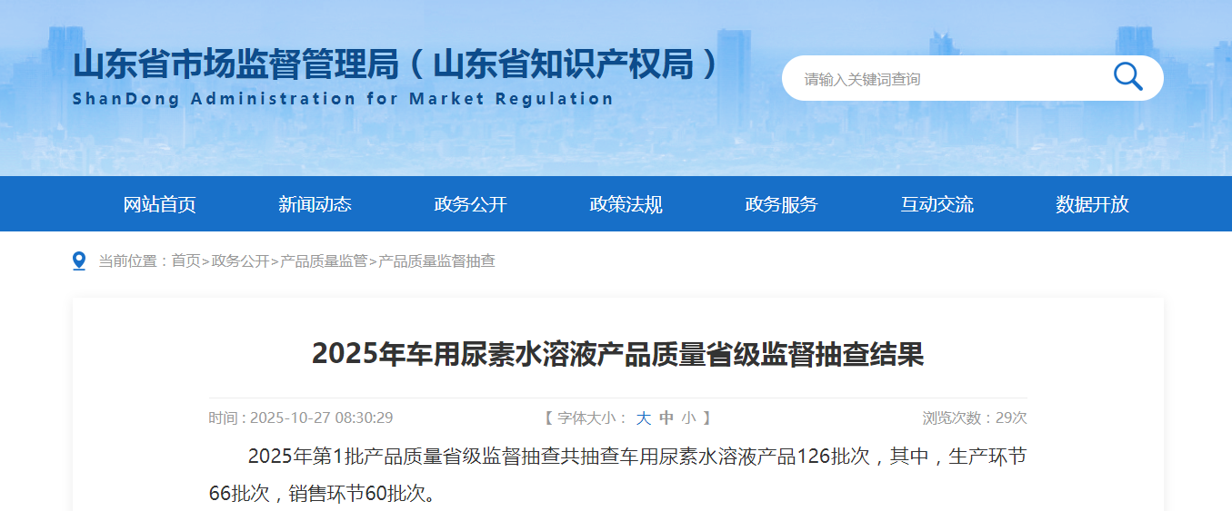 山东省市场监管局发布2025年车用尿素水溶液产品质量省级监督抽查结果