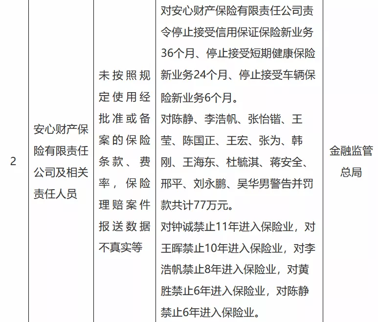 | | | 对安心财产保险有限责任公司责 | | --- | --- | --- | | | | 令停止接受信用保证保险新业务 | | | | 36个月、停止接受短期健康保险 | | | 未按照规 | 新业务24个月、停止接受车辆保 | | | 定使用经 | 险新业务6个月。 | | 安心财产保 | 批准或备 | 对陈静、李浩帆、张怡锴、王 | | 险有限责任 | 案的保险 | 莹、陈国正、王宏、张为、韩 문물 | | | 条款、费 | 刚、王海东、杜毓淇、蒋安全、 | | 公司及相关 | | 5 | | 责任人员 | 率,保险 | 邢平、刘永鹏、吴华男警告并罚 | | | 理赔案件 | 款共计77万元。 | | | 报送数据 | 对钟诚禁止11年进入保险业,对 | | | 不真实等 | 王晖禁止10年进入保险业,对李 | | | | 浩帆禁止8年进入保险业,对黄 | | | | 胜禁止6年进入保险业,对陈静 | | | | 禁止6年进入保险业。 | (国家金融监督管理总局) 12月19日,国家金融监督管理总局披露的行政处罚信息显示,因存在未按照规定使用经批准或备案的保险条 款、费率,保险理赔案件报送数据不真 ...