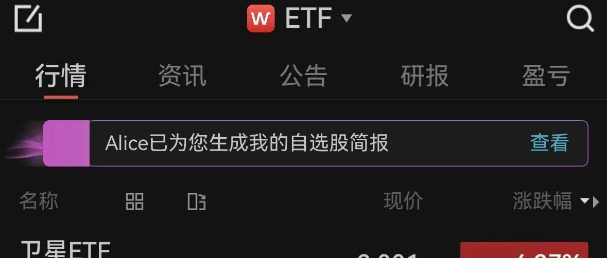 你们你追我赶!争分夺秒! 你们妈知道吗? | 11 | W ETF . | | | | | --- | --- | --- | --- | --- | | 行情 | 资讯 公告 | | 研报 | 图与 | | | Alice已为您生成我的自选股简报 | | | 查看 | | 名称 品 | E | 现价 | | 张跌幅 ▼▶ | | 卫星ETF | | 2.001 | | 6.27% | | 基 159206 | | | | | | 传媒ETF | | 1.160 | | 6.13% | | 基 512980 | | | | | | 卫星产业ETF | | 2.148 | | 5.92% | | 基 159218 | | | | | | XI二南英伟 | | 20.420 | | 4.45% | | 7388 | | | | | | 稀土ETF | | 1.464 | | 3.90% | | 基 159713 | | | | | | 软件ETF | | 0.944 | | 3.62% | | 基 159852 | | | | | | 黄金股ETF | | 2.186 | | 3.06% | | 其 517520 ...