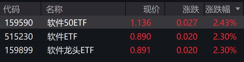 | 代码 | 名称 | 现价 | | 涨跌 | | --- | --- | --- | --- | --- | | 159590 | 软件50ETF | 1.136 | 0.027 | 2.43% | | 515230 | 软件ETF | 0.890 | 0.020 | 2.30% | | 159899 | 软件龙头ETF | 0.891 | 0.020 | 2.30% | 有机构表示,在当前全球科技竞争日益激烈的背景下,基础软件的自主可控不仅是国家安全的需求,也是产业可持续 发展的必然选择。未来基础软件企业将面临更高的技术要求和更强的竞争压力,但也意味着更多的市场机遇。随着国 产化替代的持续推进和产业链金融服务的不断深化,基础软件企业将有望实现从"跟跑"到"并跑"再到"领跑"的转变, 为我国新型工业化和高质量发展提供坚实的底层技术支撑。 (文章来源:每日经济新闻) 软件概念股走强,三六零涨超8%,用友网络涨超4%,金山办公、恒生电子涨超3%。 受盘面影响,软件相关ETF涨超2%。 ...