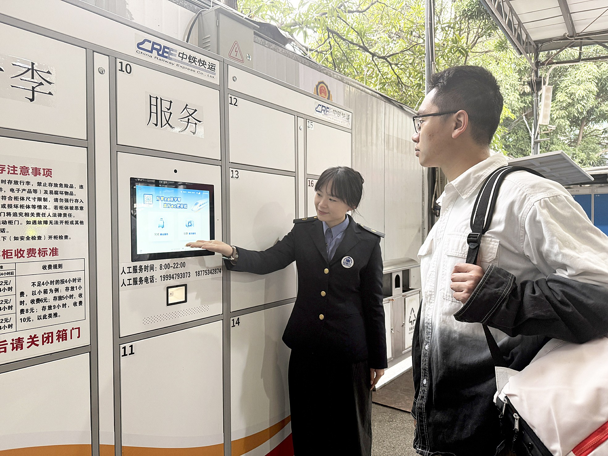 子注意事项 工作人员正在办理宠物 柜收费标准 收费规则 惟 4小时后 2元/ 不足4小时的按4小时计 小时 费,以小箱为例:存放1小 2元/ 时,收费6元;存放5小时,收 时时 费8元; 存放9小时,收费 2元/ 10元,以此类推。 小时 言请关闭箱门 在南宁站出站口处,工作人员引导旅客使用"轻装行"服务。 本报通讯员汪璐璐 摄 lo 9 9 0 13 人工服务时间: 8:00-22:00 人工服务电话: 19994793073 18775342874 14 11 托运业务手续。 本报通讯员程睿哲 摄 本报讯(记者黎兆齐 通讯员宋斯丽于莉)提着大包小包赶高铁、过安检手忙脚乱的春运场景将大幅减少。2026年春运将至,国铁南宁局联合中铁快运南宁 分公司聚焦"轻装行""带宠行"两大刚需,推出便民服务新举措,让出行更从容。 时存放行李,禁止存放危险品,违 卡,电子产品等)及易腐坏物品。 符合柜体尺寸限制,请勿强行存入 或损坏柜体等情况。若柜体被恶意 门将追究相关责任人法律责任。 动柜门。如遇故障无法开柜或其他 话。 据介绍,1月15日,南宁站、南宁东站、柳州站、桂林站、桂林北站已开通"轻装行"业务,后续将陆续开通桂林 ...