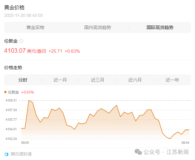 19日国际金价上涨 贵金属方面,全球风险资产抛售潮推动部分资金流向黄金避险,国际金价周三盘中一度重回每盎司4100 美元关口上方,但受到美元指数显著上涨的打压,金价涨幅有所收窄。截至收盘,纽约商品交易所12月 黄金期价收于每盎司4082.8美元,涨幅为0.40%。 11月20日,国际金价继续上涨态势,目前报价4103.07美元/盎司。 19日国际油价跌超2% 原油期货方面,美国能源信息局周三公布的数据显示,上周美国汽油库存环比增加232.7万桶,而市场 预期这一库存数据会出现下降。汽油库存增加或暗示美国石油消费端需求疲软,国际油价周三跌超 2%。截至收盘,纽约商品交易所12月交货的轻质原油期货价格收于每桶59.44美元,跌幅为2.14%;明 年1月交货的伦敦布伦特原油期货价格收于每桶63.51美元,跌幅为2.13%。 复审:邢 璐 终审:戈驰川 来源:央视财经、江苏新闻 初审:田 芳 ...