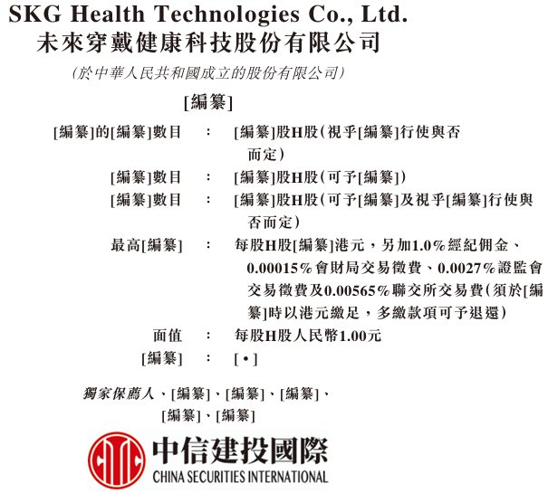 智通财经APP获悉,据港交所12月17日披露,未来穿戴健康科技股份有限公司(简称:未来穿戴)向港交 所主板递交上市申请,中信建投国际为独家保荐人。根据弗若斯特沙利文的资料,按GMV计算,该公 司在中国智能舒缓穿戴设备行业位列国内企业之首,于2024年占中国国内市场份额达21.5%。 据招股书,该公司打造多元化的产品矩阵,涵盖智能舒缓穿戴设备、运动后恢复及塑形设备、智能健康 手表及健康家居产品,致力提升客户的日常健康及生活品质。该公司多款产品开创行业先河,创新应用 中频脉冲、经皮神经电刺激(TENS)等广泛应用于医疗领域的专业科技。 | 纂]的[编纂]數目 | | : [編纂]股H股(視乎[編纂]行使與否 | | --- | --- | --- | | | | 而定) | | [编纂]數目 | .. | [编纂]股H股(可予[编纂]) | | [编纂]數目 | .. | [編纂]股H股(可予[編纂]及視乎[編纂]行使與 | | | | 否向定) | | 最高[编纂] | .. | 每股H股[編纂]港元,另加1.0%經紀佣金、 | | | | 0.00015%會財局交易徵費、0.0027%證監會 | | | | ...