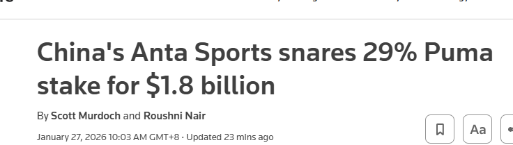 1月27日消息,据路透社报道,中国安踏体育用品有限公司(2020.HK)周二表示,将以15亿欧元(约合 18亿美元)的价格从皮诺家族手中购入德国运动品牌彪马(PUMG.DE)29.06%的股份,成为彪马的最 大股东。 安踏体育在提交给证券交易所的文件中表示,将以每股35欧元的现金价格购买4300万股彪马股份。这一 价格较彪马周一21.63欧元的收盘价溢价62%,当日彪马股价在交易时段内上涨近17%。周二早盘,安踏 体育股价上涨3.4%。 报道称,此次股份出售正值彪马在失去耐克(NKE.N)和阿迪达斯(ADSGn.DE)的市场份额后,寻求 重振业绩之时。同时,彪马还面临着来自新百伦(New Balance)和霍卡(Hoka)等快速增长品牌的竞 争。 安踏体育表示,相信随着安踏成为彪马的最大投资者,彪马能够提升国际竞争力,并增强品牌认知度。 安踏体育称,一旦交易最终敲定,将寻求在彪马董事会中获得席位。 2025年8月,丁世忠发布公开信提到,安踏并购战略会优先考虑符合公司发展战略,聚焦两类机会:一 是,收购具有强品牌价值和基因的品牌,通过战略重塑实现价值跃升;二是,投资高潜力的新兴品牌, 在早期建立合作,探索共同成 ...