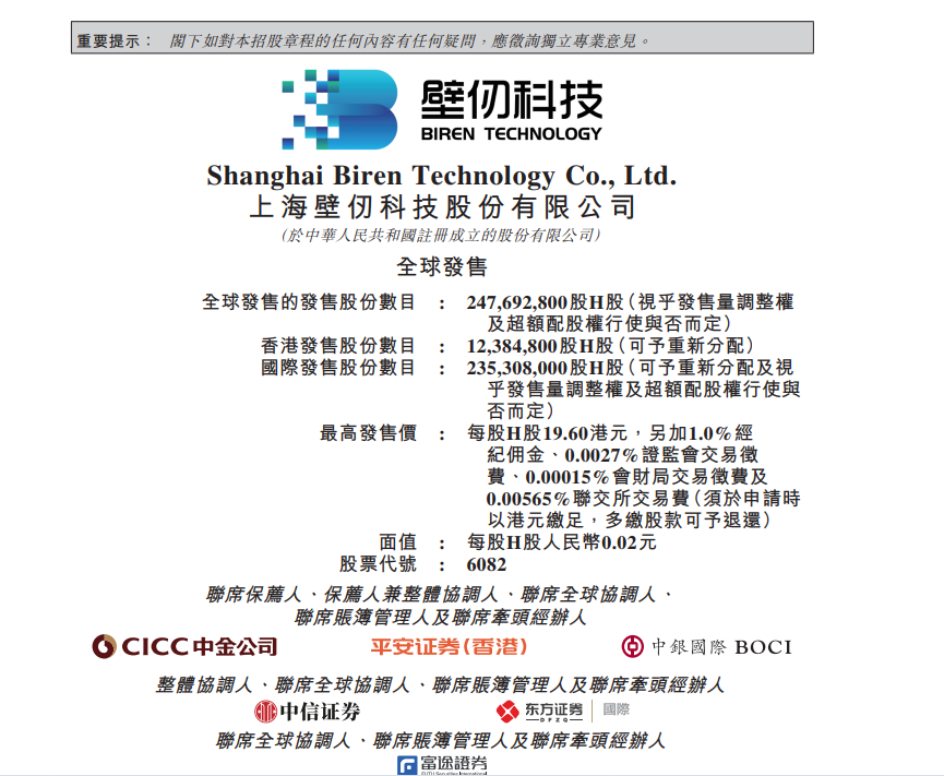 在与同行的激烈竞争中,被称为"国产GPU四小龙"之一的壁仞科技向"港股GPU第一股"的目标迈出了关键一步。 12月22日,根据壁仞科技向香港交易所提交的公告,公司计划在全球发售247,692,800股H股,发行价格区间定为每股17.00港元至19.60港元。若以 发行价上限计算,且不行使超额配股权,此次IPO最多可募集约48.55亿港元。 公告显示,壁仞科技的股票代码为"6082",预计其H股将于明年1月2日正式在港交所主板开始交易。此次IPO正值公司商业化初期的关键阶段,其 营收呈现爆发式增长,但持续的巨额亏损也给其未来发展带来了不确定性。募集资金的注入,对于公司推进下一代产品研发、在由少数巨头主导 的市场中争夺份额至关重要。 | 重要提示: 閣下如對本招股章程的任何內容有任何疑問,應徵詢獨立專業意見。 | | --- | | 壁の科技 | | BIREN TECHNOLOGY | | Shanghai Biren Technology Co., Ltd. | | 上海壁仍科技股份有限公司 | | (於中華人民共和國註冊成立的股份有限公司) | | 全球發售 | | 全球發售的發售股份數目 : 247.69 ...