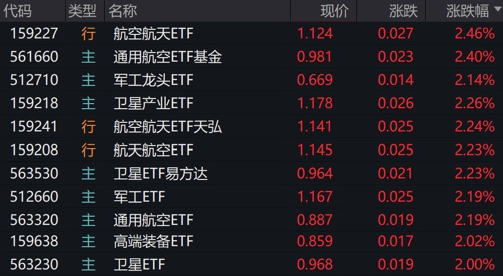 军工概念股早盘走强,新雷能涨超7%,海格通信涨超5%,光启技术、中国卫星涨超4%,中航沈飞、航天电子涨超3%。 | 代码 | 类型 名称 | | 现价 | 涨跌 | 涨跌幅 | | --- | --- | --- | --- | --- | --- | | 159227 | 行 | 航空航天ETF | 1.124 | 0.027 | 2.46% | | 561660 | 王 | 通用航空ETF基金 | 0.981 | 0.023 | 2.40% | | 512710 | 主 | 军工龙头ETF | 0.669 | 0.014 | 2.14% | | 159218 | 主 | 卫星产业ETF | 1.178 | 0.026 | 2.26% | | 159241 | 行 | 航空航天ETF天弘 | 1.141 | 0.025 | 2.24% | | 159208 | 行 | 航天航空ETF | 1.145 | 0.025 | 2.23% | | 563530 | 主 | 卫星ETF易方达 | 0.964 | 0.021 | 2.23% | | 512660 | 主 | 军工ETF | 1.167 | 0.025 ...