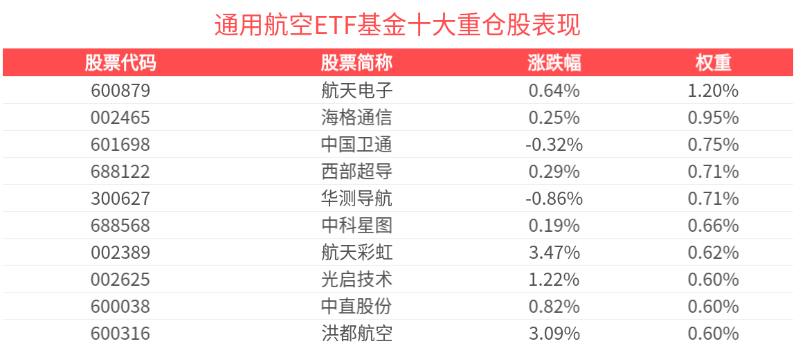 通用航空ETF基金紧密跟踪中证通用航空主题指数,成分股行业分布军工占比达到76.9%(航空装备、军工电子、航天装备),盘中涨超1.4%。 | 股票代码 | 股票简称 | 涨跌幅 | 权重 | | --- | --- | --- | --- | | 600879 | 航天电子 | 0.64% | 1.20% | | 002465 | 海格通信 | 0.25% | 0.95% | | 601698 | 中国卫通 | -0.32% | 0.75% | | 688122 | 西部超导 | 0.29% | 0.71% | | 300627 | 华测导航 | -0.86% | 0.71% | | ୧୫୫୧୧୫ | 中科 | 0.19% | 0.66% | | 002389 | 航天彩虹 | 3.47% | 0.62% | | 002625 | 光启技术 | 1.22% | 0.60% | | 600038 | 中直股份 | 0.82% | 0.60% | | 600316 | 洪都航空 | 3.09% | 0.60% | 中证通用航空主题指数选取50只业务涉及航空材料及零部件、通航飞行器制造、通航基础设施、通航运营与保障 ...