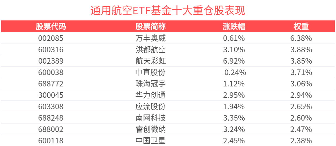 | 股票代码 | 股票简称 | 涨跌幅 | 权重 | | --- | --- | --- | --- | | 002085 | 万丰奥威 | -0.79% | 6.38% | | 600316 | 洪都航空 | -2.99% | 3.88% | | 002389 | 航天彩虹 | -1.40% | 3.85% | | 600038 | 中直股份 | -0.76% | 3.71% | | 688772 | 珠海冠宇 | -0.86% | 3.06% | | 300045 | 华力创通 | -3.68% | 2.94% | | 603308 | 应流股份 | 2.03% | 2.65% | | 688248 | 南网科技 | 1.67% | 2.60% | | 688002 | 睿创微纳 | 1.10% | 2.47% | | 600118 | 中国卫星 | -4.92% | 2.38% | (以上所列股票仅为指数成份股,无特定推荐之意) 开源证券分析指出,中国商业航天正迈入技术迭代与产业落地双轮驱动的新发展阶段,行业增长动能显著增强。 通用航空ETF基金紧密跟踪国证通用航空产业指数,截至2025年12月31日, ...
